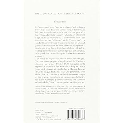 Li Guangtou et Song Gang ne sont pas d'authentiques frères mais leurs destins se sont de longue date trouvés liés pour le meilleur et pour le pire. Enfants, puis adolescents pendant la Révolution culturelle, ils atteignent l'âge adulte au moment où la Chine entre dans l'ère tumultueuse des "réformes" et de l"'ouverture". La solidarité, cimentée par les épreuves, qui les unissait jusqu'alors se fissure et leurs chemins se séparent : tandis que Song Gang, l'intellectuel doux et loyal, se voit rapidement dépassé par son époque, Li Guangtou, le brigand, tirera le meilleur parti des bouleversements en cours. En retraçant le parcours de ces deux personnages, Yu Hua interroge près d'un demi-siècle d'histoire chinoise : des années 1960 et 1970, marquées par la répression morale et les atrocités politiques, à nos jours, où les énergies individuelles se libèrent dans un désordre épique. Portrait de toute une génération, celle de la faim, de la violence, de la frénésie économique et des grandes migrations, des ascensions fulgurantes et des naufrages, Brothers compose une véritable odyssée de la Chine contemporaine, de Mao aux JO.