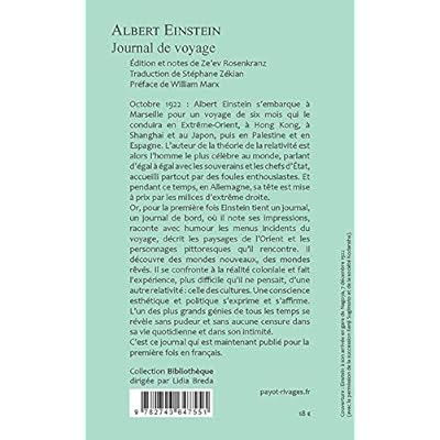 Octobre 1922 : Albert Einstein s’embarque à Marseille pour un voyage de six mois qui le conduira en Extrême-Orient, à Hong Kong, à Shanghai et au Japon, puis en Palestine et en Espagne. L’auteur de la théorie de la relativité est alors l’homme le plus célèbre au monde, parlant d’égal à égal avec les souverains et les chefs d’État, accueilli partout par des foules enthousiastes. Et pendant ce temps, en Allemagne, sa tête est mise à prix par les milices d’extrême droite. Or, pour la première fois Einstein tient un journal, un journal de bord, où il note ses impressions, raconte avec humour les menus incidents du voyage, décrit les paysages de l’Orient et les personnages pittoresques qu’il rencontre. Il découvre des mondes nouveaux, des mondes rêvés. Il se confronte à la réalité coloniale et fait l’expérience, plus difficile qu’il ne pensait, d’une autre relativité : celle des cultures. Une conscience esthétique et politique s’exprime et s’affirme. L’un des plus grands génies de tous les temps se révèle sans pudeur et sans aucune censure dans sa vie quotidienne et dans son intimité. C’est ce journal qui est maintenant publié pour la première fois.