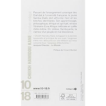 Passant de l'enseignement coranique des Diallobé à l'université française, le jeune Samba Diallo doit affronter l'exil et les brèches identitaires. Son apprentissage, philosophique, éthique et spirituel, retrace l'itinéraire d'une Afrique métissée en quête d'elle-même. Où s'élève, flamboyante, la clameur d'un peuple en mal d'existence. " Cheikh Hamidou Kane, échappant à la donnée temporelle et politique de son sujet, l'angoisse d'être noir, débouche sur une réflexion qui nous concerne tous : l'angoisse d'être homme. " Jacques Chevrier, Le MondePréface de Vincent Monteil